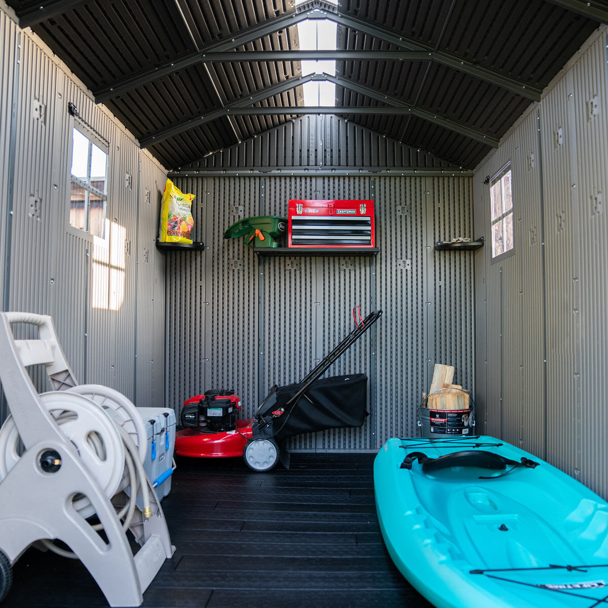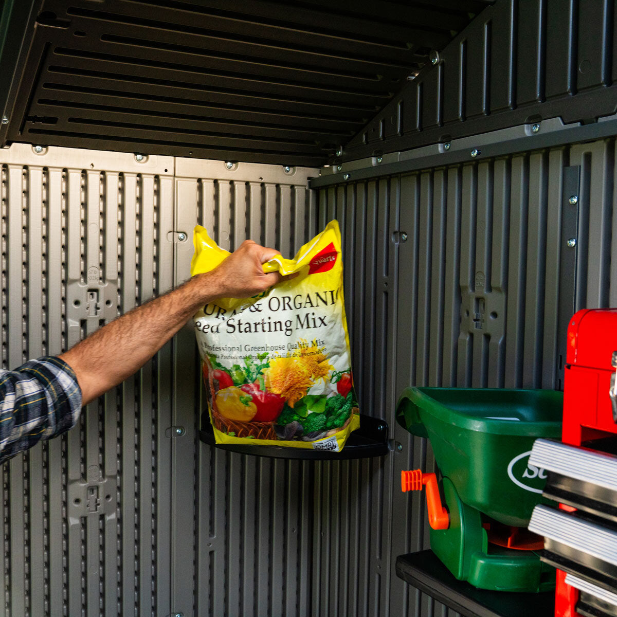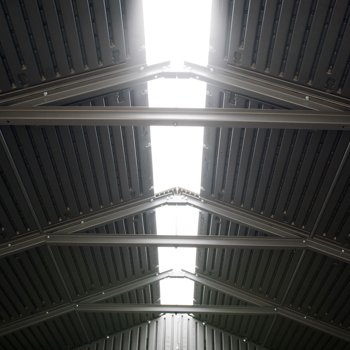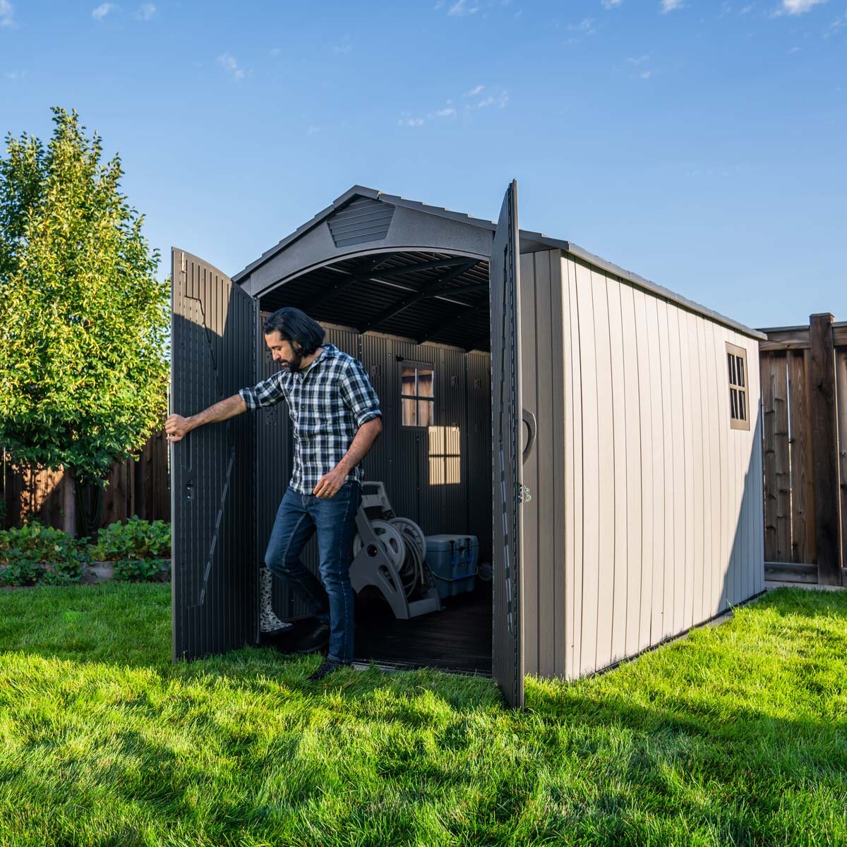Lifetime's 7-foot wide outdoor storage sheds have several innovative features, including a skylight that runs the entire length of the roof to maximize natural lighting. They also include single-hinged double doors that open nearly 180 degrees and lock closed, a slip-resistant floor, and low-maintenance, steel-reinforced construction.